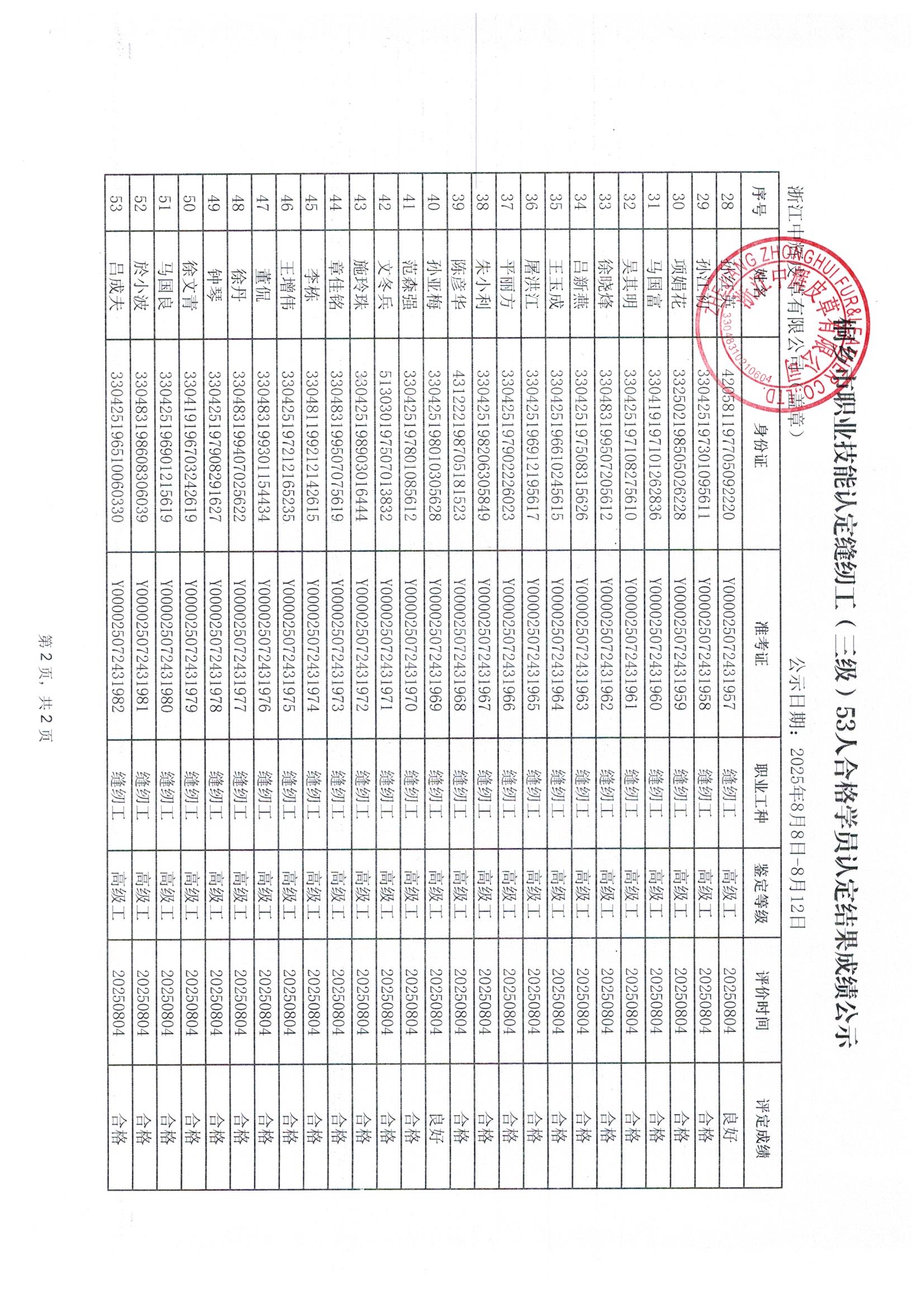 浙江午夜黄色网站皮草有限公司桐乡市职业技能认定缝纫工(三级)53人合格学员认定结果成绩公示
